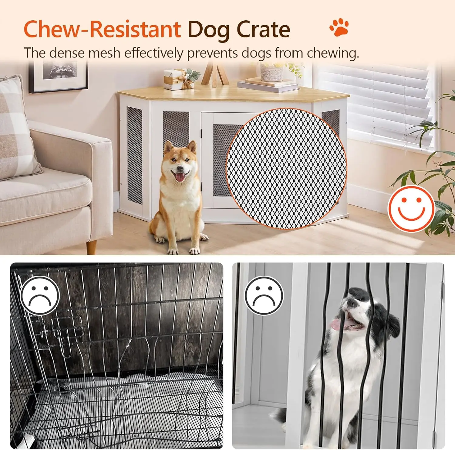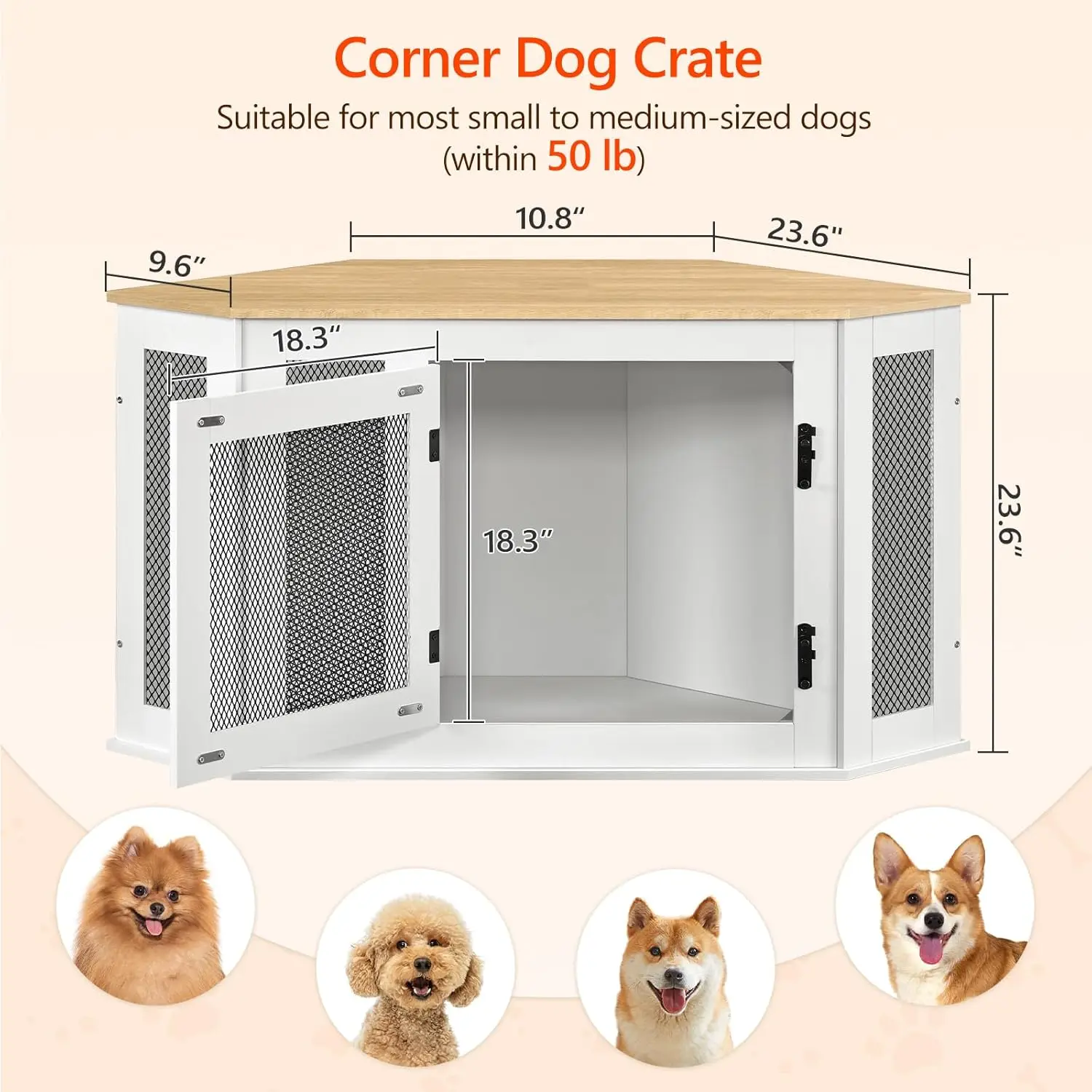 Transform your living space with this versatile corner dog crate furniture that combines functionality and style. Perfectly designed to fit snugly against walls, it maximizes corner utilization in homes with limited space, making it an ideal choice for apartments or cozy rooms. This multi-functional piece serves as a warm haven for small to medium-sized dogs up to 50 lb, providing a comfortable spot for sleeping, resting, and relaxing. Crafted from durable materials including metal mesh and high-quality engineered wood, this sturdy kennel ensures long-lasting use while offering excellent ventilation for your pet's comfort. Its vintage decorative design not only functions as a dog house but also doubles as a coffee table, side table, or TV cabinet. The spacious top surface can support up to 220 lb, allowing you to store and display items like books, plants, or electronics effortlessly. Assembly is quick and straightforward with included detailed instructions and all necessary accessories. Two types of expansion screws are provided so you can choose the best installation method based on your wall type. Enhance your home decor while giving your furry friend a secure shelter that blends seamlessly into any interior setting.