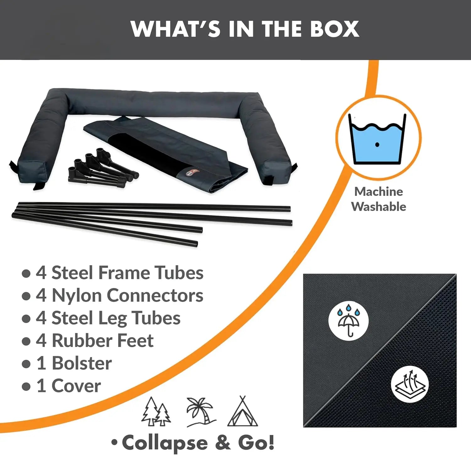 Discover the ultimate comfort and convenience for your large dog with this elevated cot bed. Perfect for both indoor and outdoor settings, it features a breathable mesh center that promotes air circulation to keep your pet cool during warm seasons, while the raised design provides 7 inches of ground clearance to protect against wet or cold surfaces, dirt, bugs, and pests. Key Benefits: - Enhanced Comfort: The cot includes fluffy plush bolsters for added security and support, helping to relieve joint pressure points and eliminate hot spots through its hammock-style design. - Durable Construction: Built with a lightweight yet strong metal frame that supports over 200 pounds, ensuring long-lasting use in various environments. Slip-resistant rubber feet safeguard indoor flooring. - Easy Maintenance: Both the removable cover and bolsters are machine washable and can be hosed off outdoors for quick cleaning. Extra covers in multiple colors are available separately for customization. - Versatile Use: No tools required for assembly or disassembly, making it ideal as a travel dog bed for camping, beach trips, or everyday home use. Its waterproof fabric repels moisture effectively. - Size Details: Measures 30 x 42 x 7 inches (width x length x height), suitable for large breeds such as Labrador Retrievers, German Shepherds, Golden Retrievers, and Doodles. This product is designed with years of expertise in pet care innovation, offering reliable quality backed by a one-year limited warranty. Elevate your dog's rest experience today!
