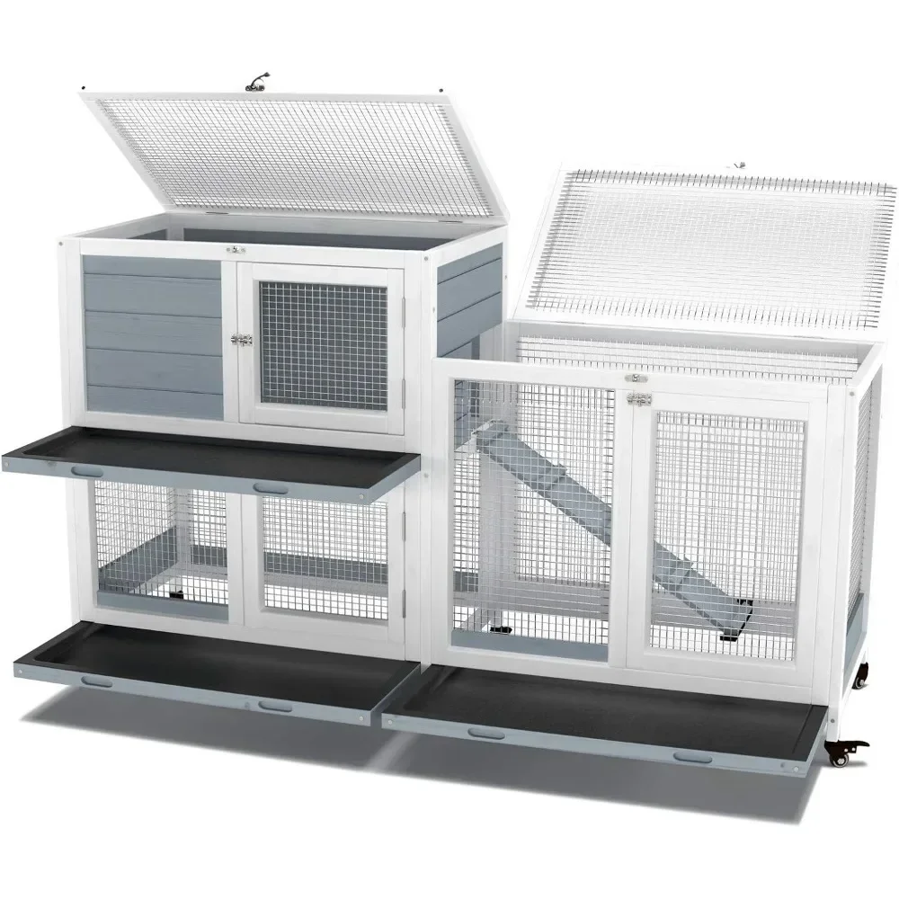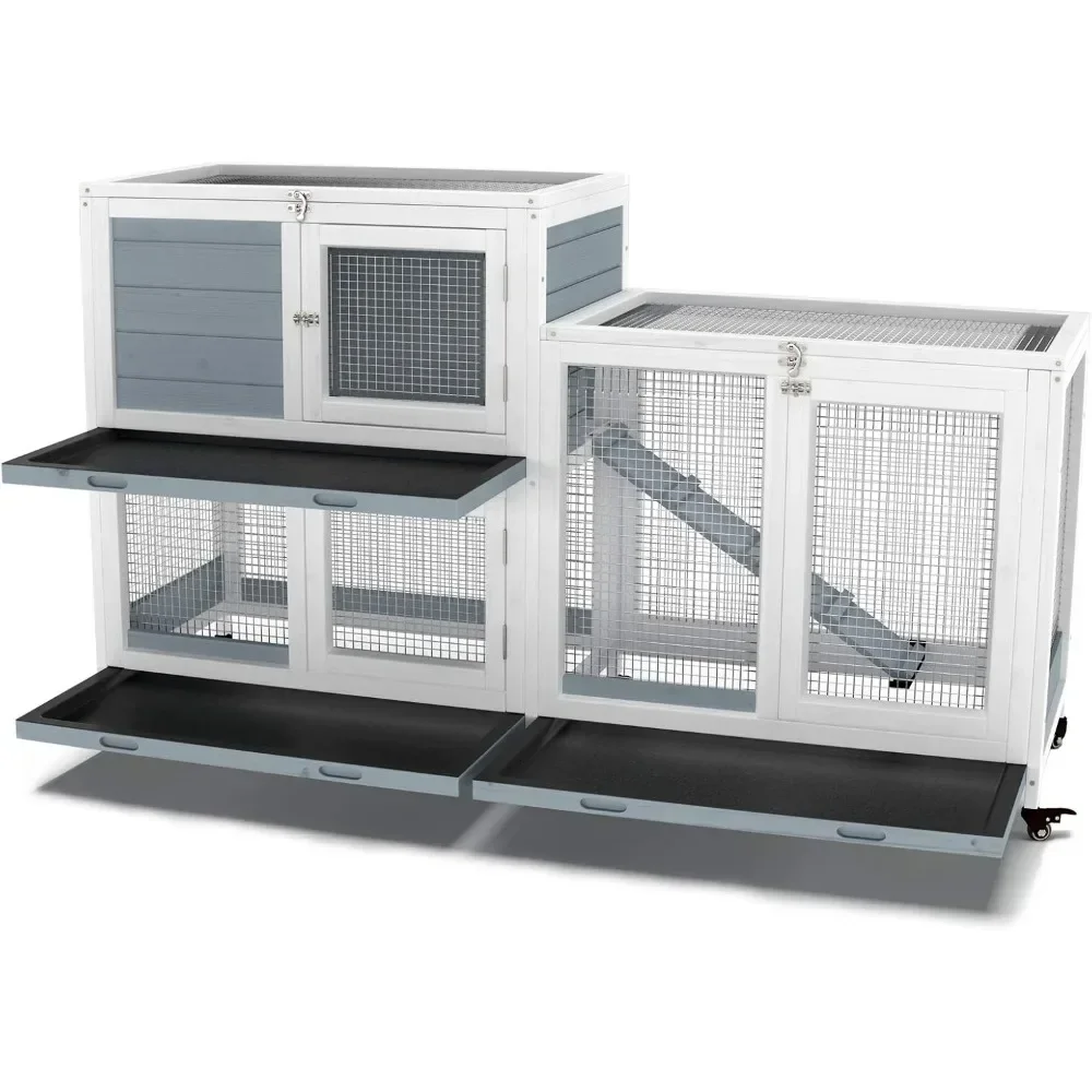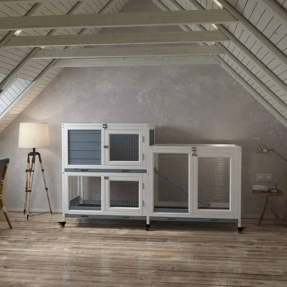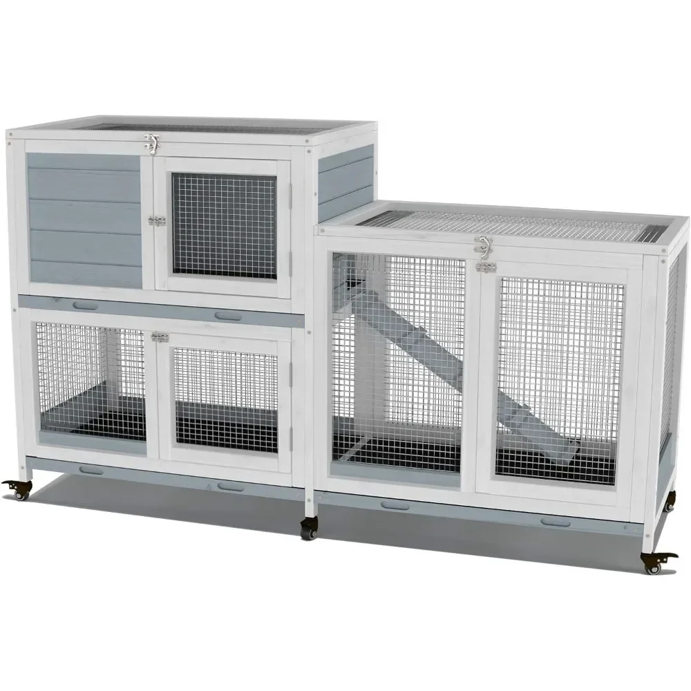 Two Floors 58" Wooden Indoor Bunny Hutch Rabbit Cage on Wheels Guinea Pig PET House for Small To Medium Animals